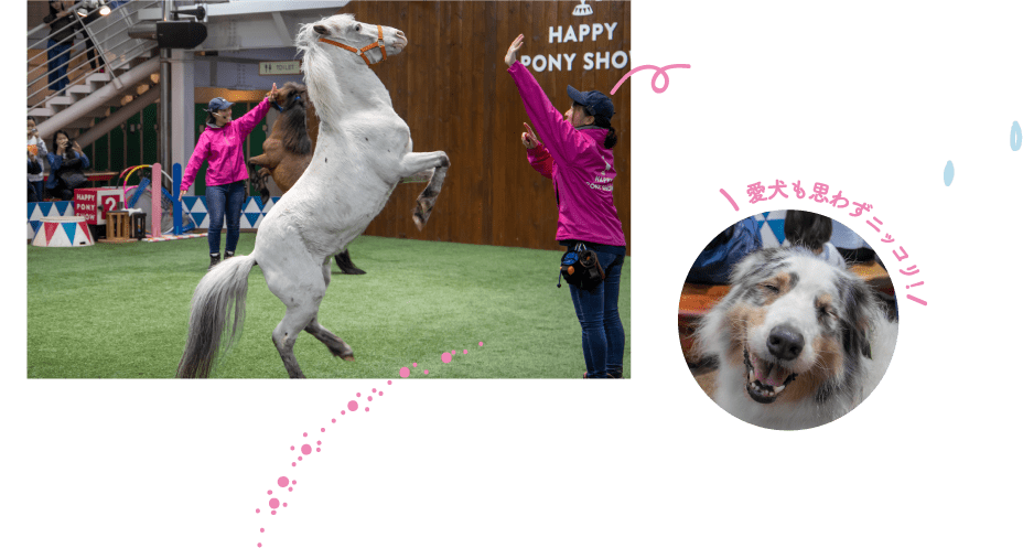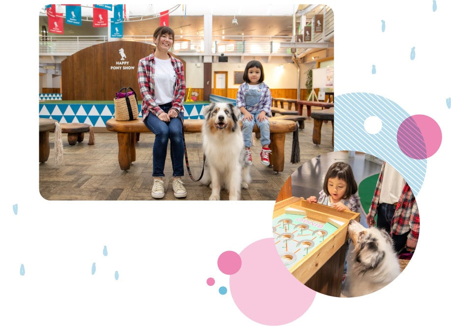 本物の馬たちがいるきゅう舎やパラッツォ・ベガ ポニー館など、ペット連れOKの施設もあるので、ぜひ、愛犬と一緒に馬たちとのふれ合いを体験しましょう。インドア乗馬場では、雨の日でも乗馬を体験することができます。