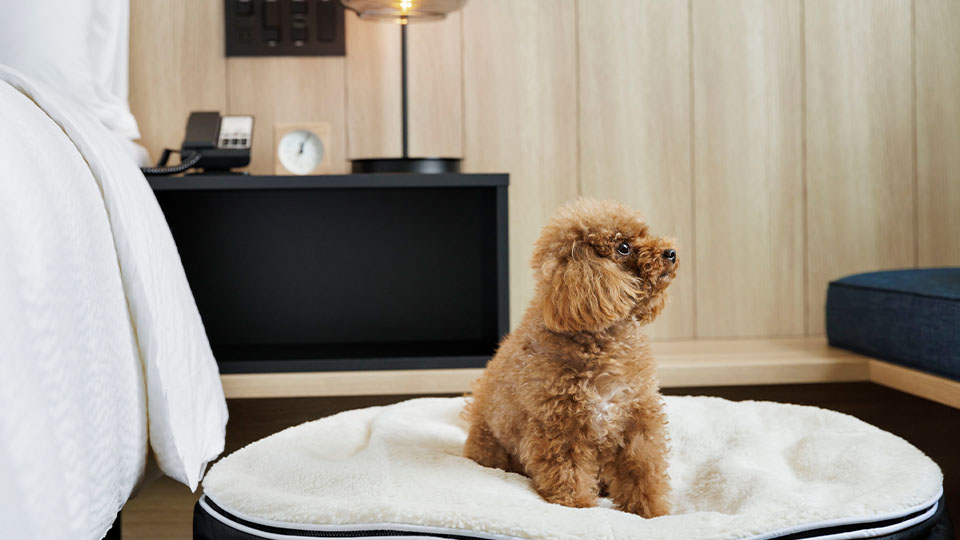 Dog Friendly Roomの客室内には、大切な愛犬にも心地より眠りをお届けし、旅行中も元気に過ごしていただけるよう睡眠と健康を守るための機能を詰め込んだ究極のペットベッドをご用意いたしました。