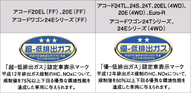 排出ガスクリーン性能。 DOHC i-VTECエンジンによる高効率な燃焼や、後方排気システム、リニアA/Fセンサー、外部EGR、均一担持キャタリスト、縮管製法コンバーターなどをそれぞれのエンジン特性に応じて採用することで、より効果的に浄化性能を高めています。これによりアコード/アコードワゴンとも全タイプで平成12年排出ガス規制値を下回り、国土交通省「超−低排出ガス」認定および「優−低排出ガス」認定をそれぞれ取得しています。 |