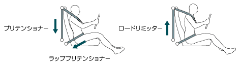 | 前方向からの強い衝撃を感知すると瞬時にシートベルトを巻き取り、その後一定以上の荷重がかかるとシートベルトを少し送りだし、胸などへの負担を軽減します。さらに、ショルダーベルト側のプリテンショナーに加え、フロント両席の腰ベルト外側にラッププリテンショナーを採用。胸部とともに腰部の乗員拘束性能をさらに高めています。 | |||