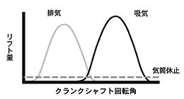 | 走行時と気筒休止時の バルブ制御。 アクセルONの状態では、吸気側、排気側ともにバルブリフト用ロッカーアームと、気筒休止用ロッカーアームをシンクロピストンによって連結し、バルブを駆動します。また、減速時やモーターのみの走行時では、吸気側、排気側ともにシンクロピストンを気筒休止用ロッカーアーム内に格納し、バルブリフト用ロッカーアームと分離。カムの力が伝わらなくなるため、バルブ作動が休止します。 |