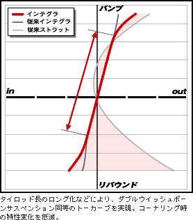 | パッケージング性に優れたフロント・トーコントロールリンク・ストラットサスペンション/リア・リアクティブリンク・ダブルウイッシュボーンサスペンションを専用設計し、スポーティークーペとしてふさわしいセッティングを追求。接地点剛性を高めるためダンパーとベアリングを新設計(フロント)。また、スタビライザーの採用(リア)、高剛性ブッシュとリアクティブリンクおよびトレーリングアームの採用(リア)、スプリングレートのセッティングなどを実施し、シャープなハンドリングと優れたスタビリティを実現しました。 また、タイロッドをロング化するなどにより、フロントのトー特性カーブをストレート化。旋回時の特性変化を抑えリニアな応答性を実現。さらに、サスペンションジオメトリーの設定によって、ロールセンター高とロール仮想アーム長の前後バランスを見直し、コーナリング時の姿勢変化を最適化。常用域からスポーティー領域に至るまで、小気味よく安定したハンドリングと乗り心地を実現しました。 |