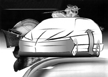 | 中世ヨーロッパの竜騎兵の鎧をモチーフに、なだらかな曲線とシャープな直線を融合した、鋭さと重厚感を伴った機能美を追求しました。低重心で地に足がついた精悍なウエッジシェイプが、ボディ全体に走りの躍動感を表現。なだらかなスロープフォルムとすることで内に広がる豊かな居住空間を実現しています。また、フロントビューは、クロームトリムの大型フロントグリルの採用により、ラグジュアリー感を演出。サイドビューは、フロントからリアエンドまで流れのあるグラスラインが、伸びやかさをアピールしています。そして、大型リアコンビネーションランプとハイマウント・ストップランプなどによるリアビューは、ワイド感を表現しながらエレガントに仕上げています。 |