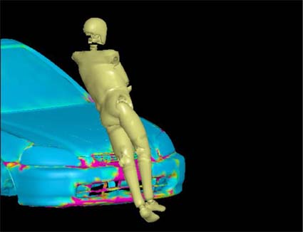 FEM (有限要素法)によってダミー形状を忠実にモデル化しました。これにより、従来の挙動評価だけでなく、ダミー傷害値が計測可能。車体形状や荷重特性評価が行え、ダミー衝突実験のシミュレーション精度も向上します。