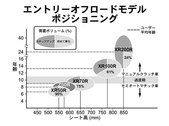 ホンダのXRシリーズ キッズラインでは、これまでエントリーバイクとしてZ50Rを発売してまいりました。しかしZ50Rは、ベース車両がモンキーであったために、子供専用のオフロード入門機種が求められていたことも実情でした。