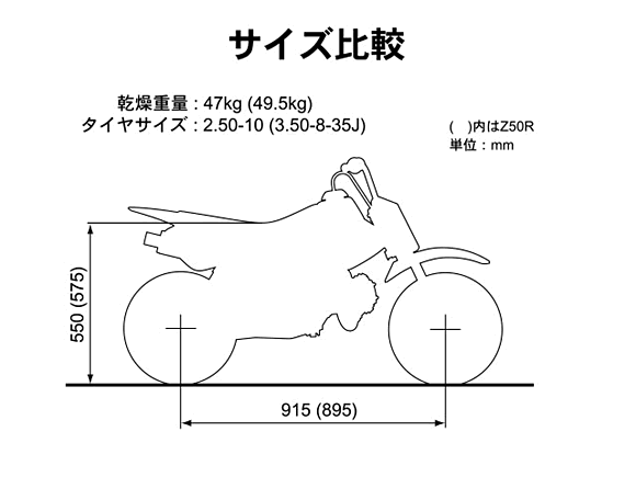 また、各パーツの軽量化を図り、乾燥重量をZ50Rから2.5kg軽い47kgとしたことで、より取り回しの軽快な車体としています。