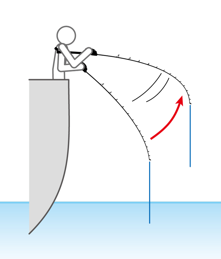 仕掛けを投入したら、指示ダナの下限(底なら海底)に到達したところで、仕掛けの全長にあたる2m分のミチイトを巻き取る。それにより、仕掛けがまっすぐに張った状態から誘いをスタートする。この時、サオの構えは水平より下。グリップエンドを脇に挟むようにするとよい。あとは、イトフケが出ないように、常にオモリを感じながらシャクっていくのが基本になる。