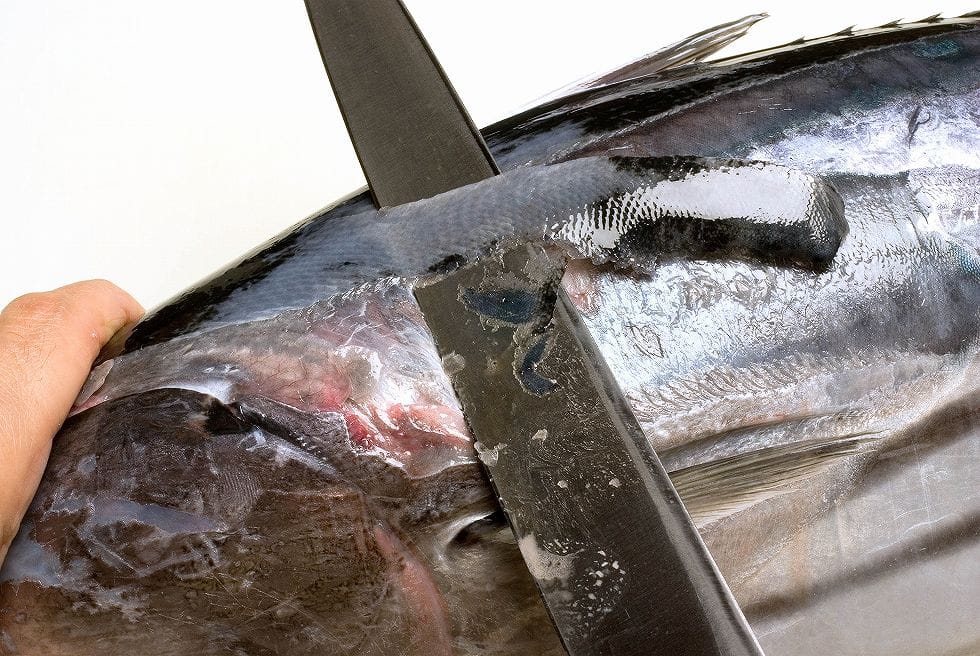 頭を切り落とす方法は“たすき切り”。まずは胸ビレ下から腹ビレ下に向かって切れ込んだら…