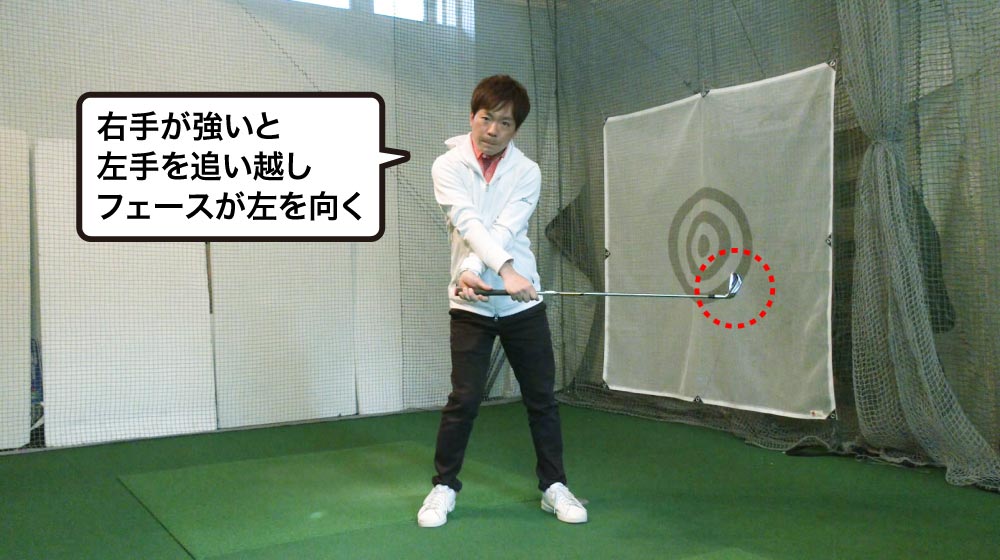 南田 その通りです。フォローサイドの動きに関しては、右手が勝っていると手が体から離れてしまいます。こういうアマチュアの方はとても多いのですが、これではうまく当たりませんし、当たったとしても左に飛ぶかネックに当たってシャンクになります。