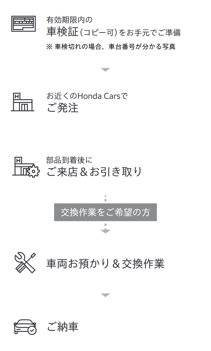 部品の種類と作業を行うHonda Carsの車両受け入れ状況によります。詳しくはHonda Carsにお問い合わせください。