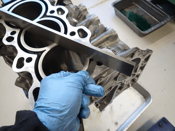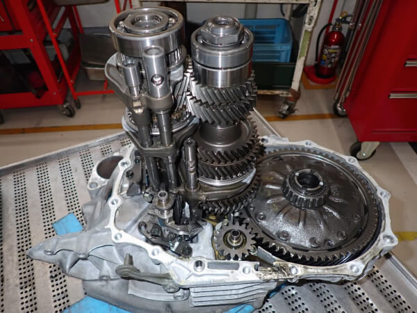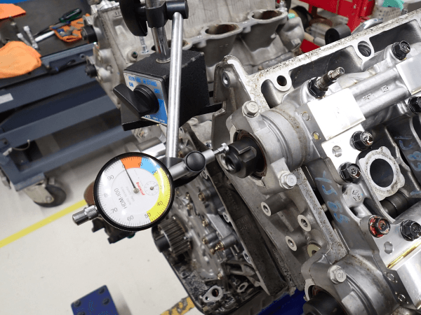 車体からエンジンを降ろし、消耗度合いを判断するために圧縮圧力を測定。そのあとトランスミッションと分離したうえで、エンジンブロック単体まで完全に分解して、新品に交換する部品と再使用する部品を選別します。
