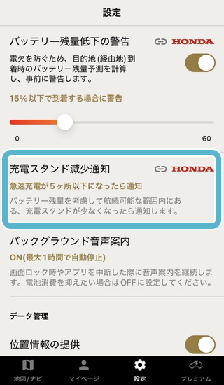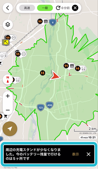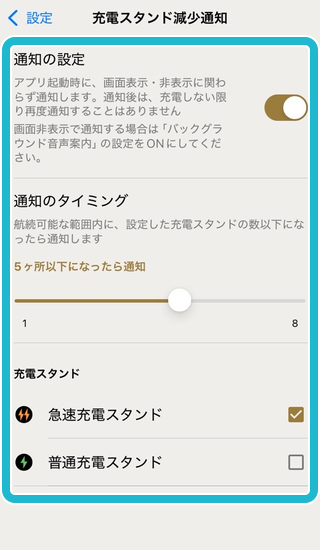 アプリ起動時(ナビ非使用時のみ)に、航続可能範囲内の充電スタンドが設定数以下になると通知されます。