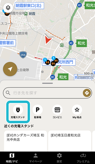 警告通知をタップすると目的地周辺の充電スタンドが表示されます。