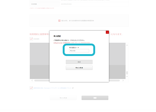 サービス内容及び利用規約、重要事項をよくお読みいただき、問題なければ「成人の方、または未成年の方は保護者の同意済み」にチェックし、「確認」をタップ。