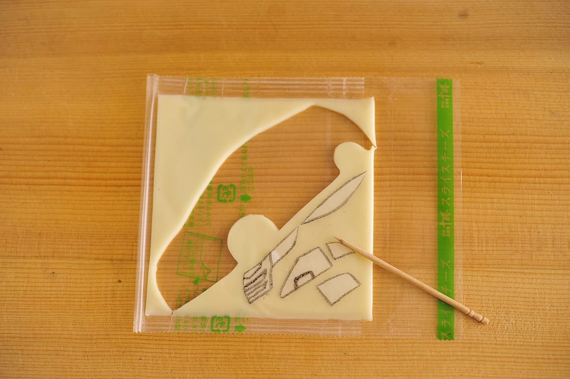 2. 1)の型紙をスライスチーズに乗せ、楊枝でカットし、土台を作る。