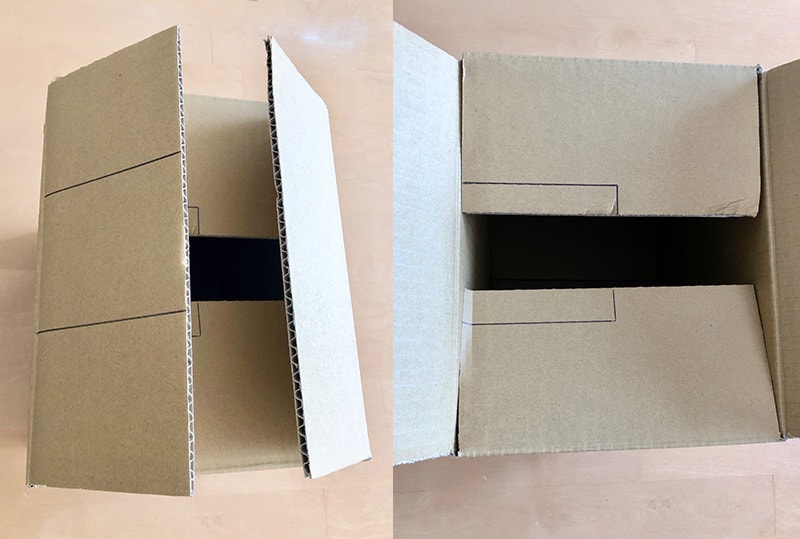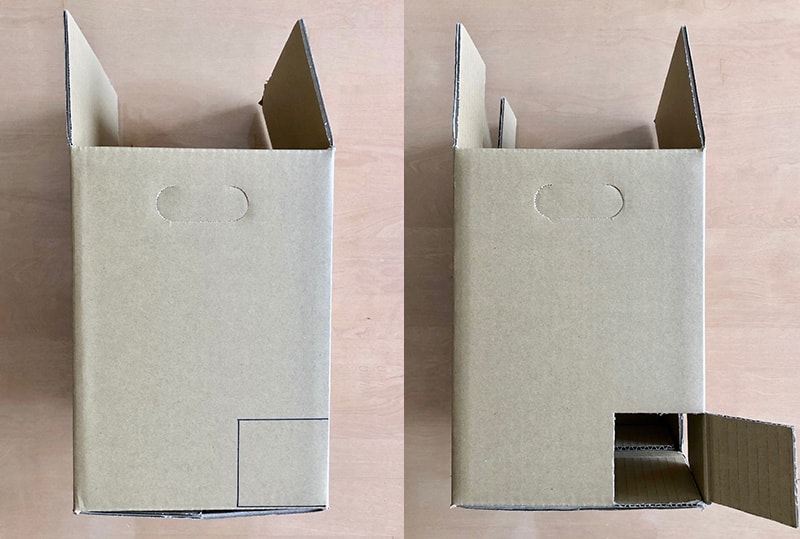 ダンボール箱に線をかいて、カッターやはさみで切っていくよ。箱の底はガムテープでとじておこう。