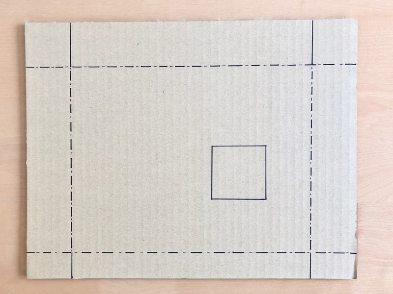 板ダンボール(カプセル入れの底用)に図のように線をかいて、切り取り線の部分を切り、谷折り線にはカッターで折りスジをつけよう。