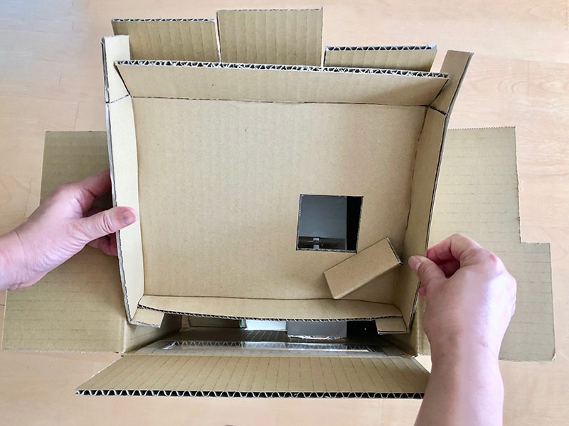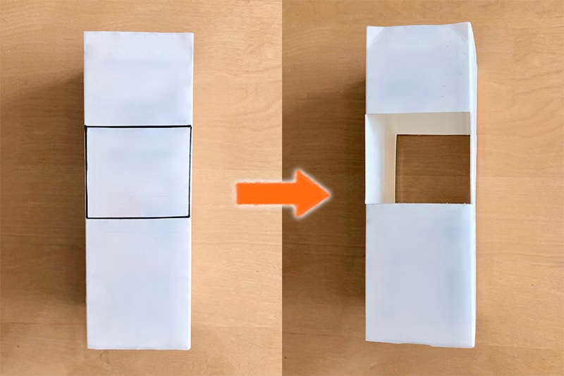 上から6cmくらいのところに、7cm×7cmの四角い穴を、はさみやカッターを使ってあけよう。手を切らないように気をつけよう。