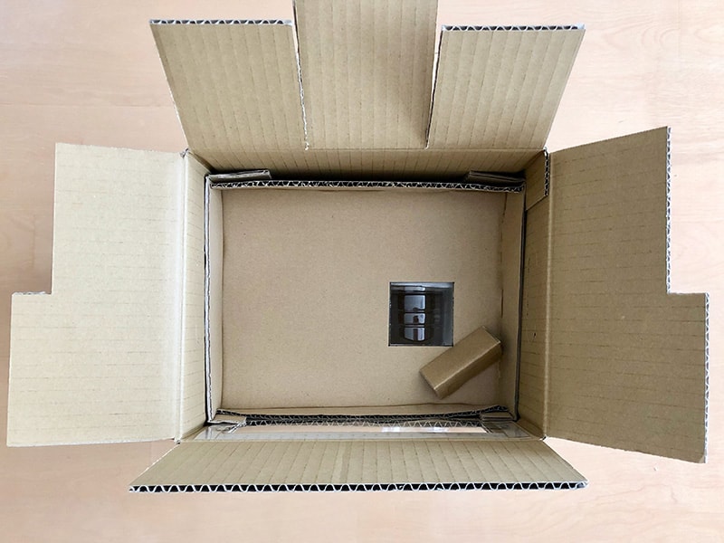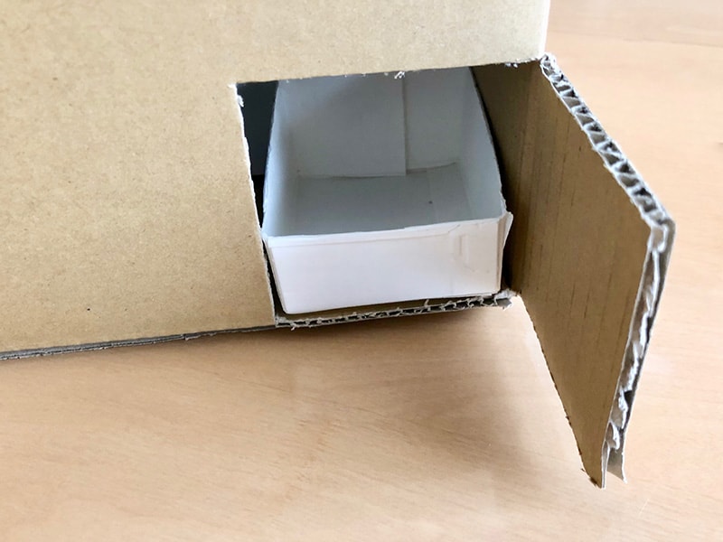 牛乳パック④をダンボール箱の正面から見て、左奥に入れよう。これはカプセル入れをささえる柱になるよ。底を両面テープなどで固定しよう。