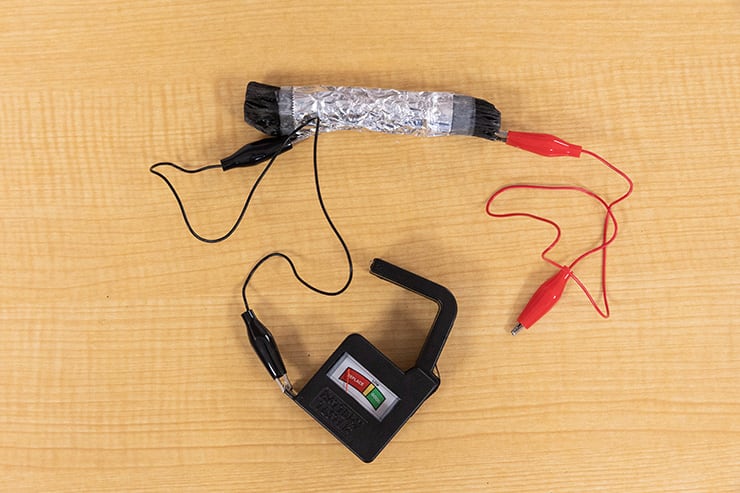 バッテリーチェッカーに、備長炭がプラス、アルミホイルがマイナスになるようにリード線をつなぐ。