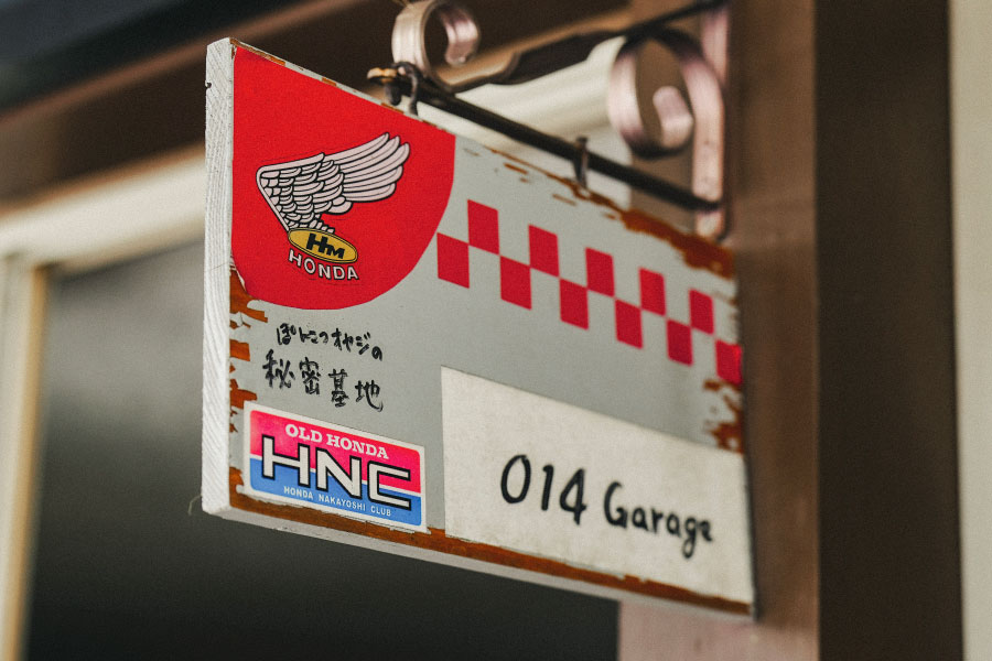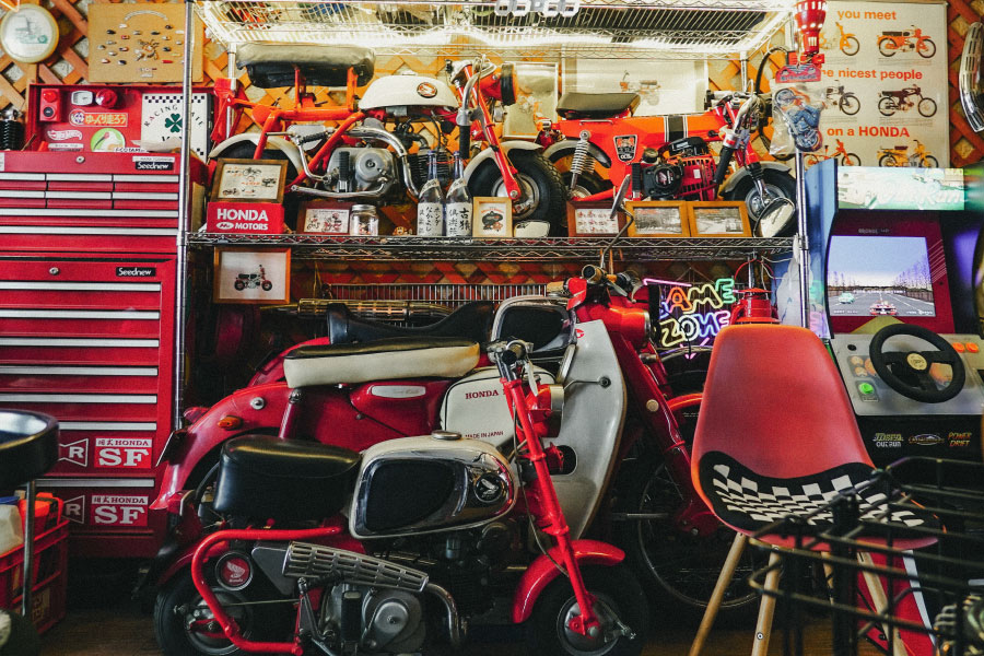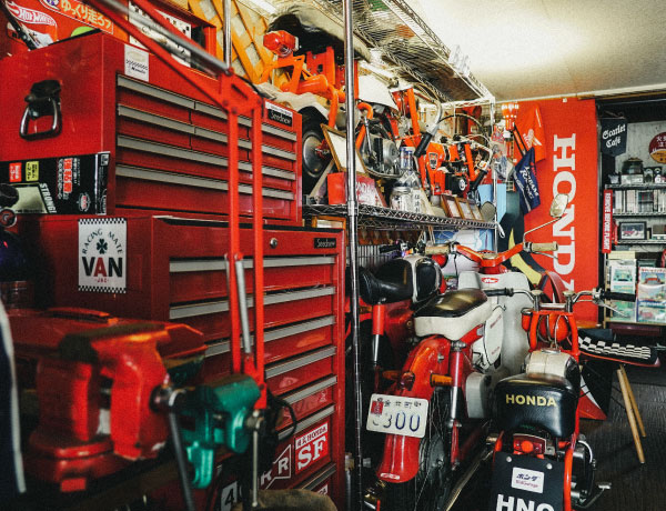 ──ガレージへと案内されると、そこは一面、赤いHondaの世界。S660、N-BOX SLASH、カブ、モンキー、モトコンポに発電機も。さらにHondaグッズが所狭しと並んでいました。
