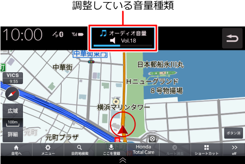- 音声案内が出力されているときは、オーディオ音量が小さくなります。