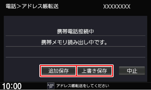 [上書き保存]にタッチした場合、本機に登録済みのアドレス帳を全て削除した後に、メモリ読み出しが開始されることがあります。
