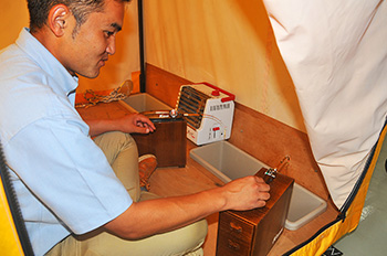 モデルは半袖だが、本来このテントは、厳冬下のワカサギ釣りに使われる。K-ZANオリジナルの電動リールを装着した研磨竿先を、左右に配置したワカサギ会津桐タンスという物入れの天板に載せ、あたりを待つ。暖かく、楽そうだ。アイデア豊かな高木氏の提案だ。