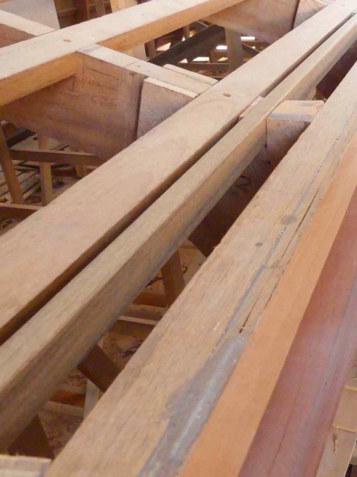 船側と同じホンジュラス・マホガニーを2層で使う。