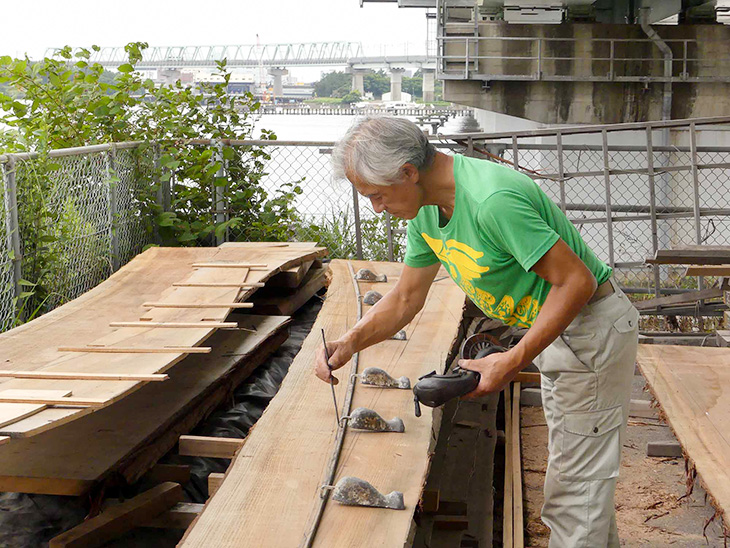 上棚が並べられた。向かって左側が右舷、右側が左舷に使われる。写真下が船尾の戸立、上が船首の水押方向となる。ひと目で曲線であることがわかるが、正確にはS字形状となっている。定間隔で掘られているのが、入れ頭(いれがしら)。佐野社長がノミをふるって、丁寧に造りこんでいた。