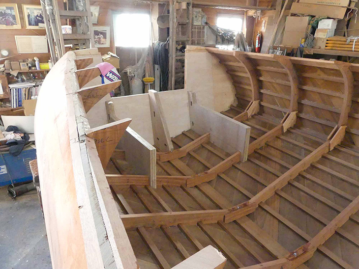この写真では、チーク材が斜め張りされたダブルプランキング1層目の状態がよくわかる。