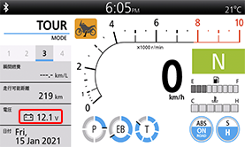1.イグニッションスイッチをONにする。マルチインフォメーションディスプレイに表示されるバッテリー電圧が12.0V以上である事を確認する。バッテリの消耗を抑えるため、グリップヒーター、フォグランプ等はOFFにしてください。