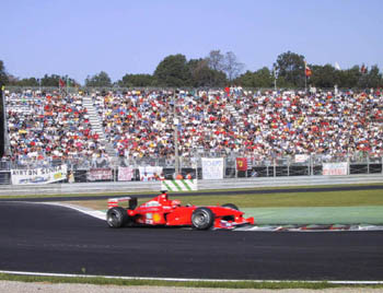 1コーナーを抜けていくシューマッハ。観客席はまっかっか。フェラーリが近づいてくると大声援。それに応えて、フロントロー独占。役者です。