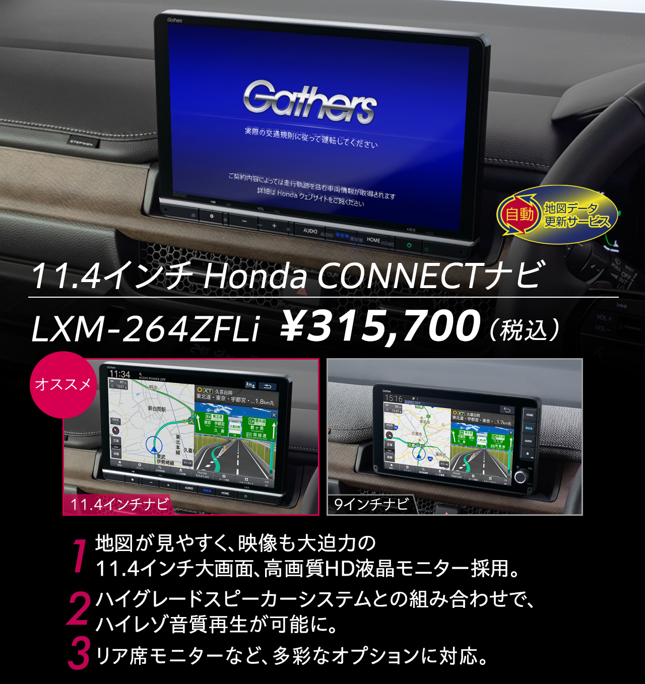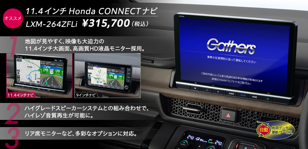 ※「Honda CONNECT for Gathers+ナビ装着用スペシャルパッケージ」は、メーカーの工場で装着するため、車両のご注文後はお受けできませんのでご了承ください。詳しくは販売会社にお問い合わせください。