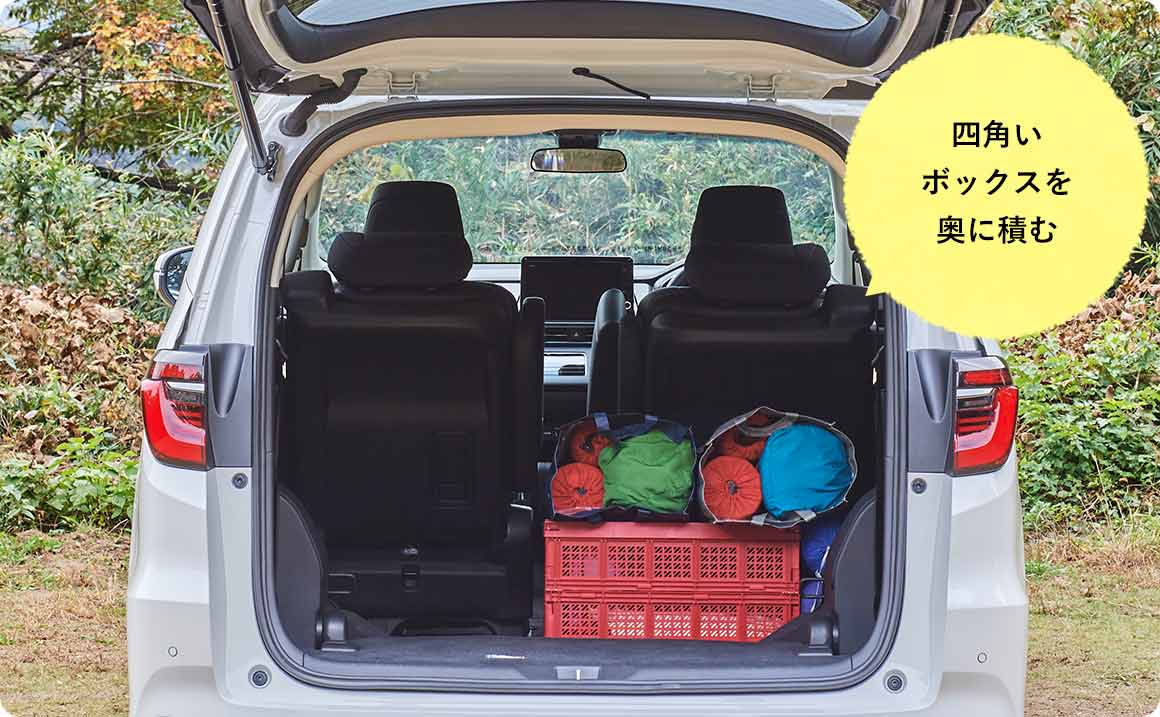 キャンプ道具は使う順番を考慮して積載するのがセオリー。一番奥に積むコンテナボックスの中には、焚き火道具やランタンなど、キャンプサイト設営の終盤や日が落ちた夕方以降に使うアイテムを入れておくと、スマートな荷下ろしが可能だ。なお、寝袋やマットなどの寝具類も同様の理由で、積み込みの早い段階で積載しておくと良い。