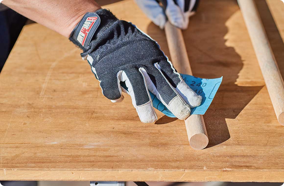 丸棒にヤスリがけをし、バリをとってなめらかにしたら、油性ニススプレーを塗布。