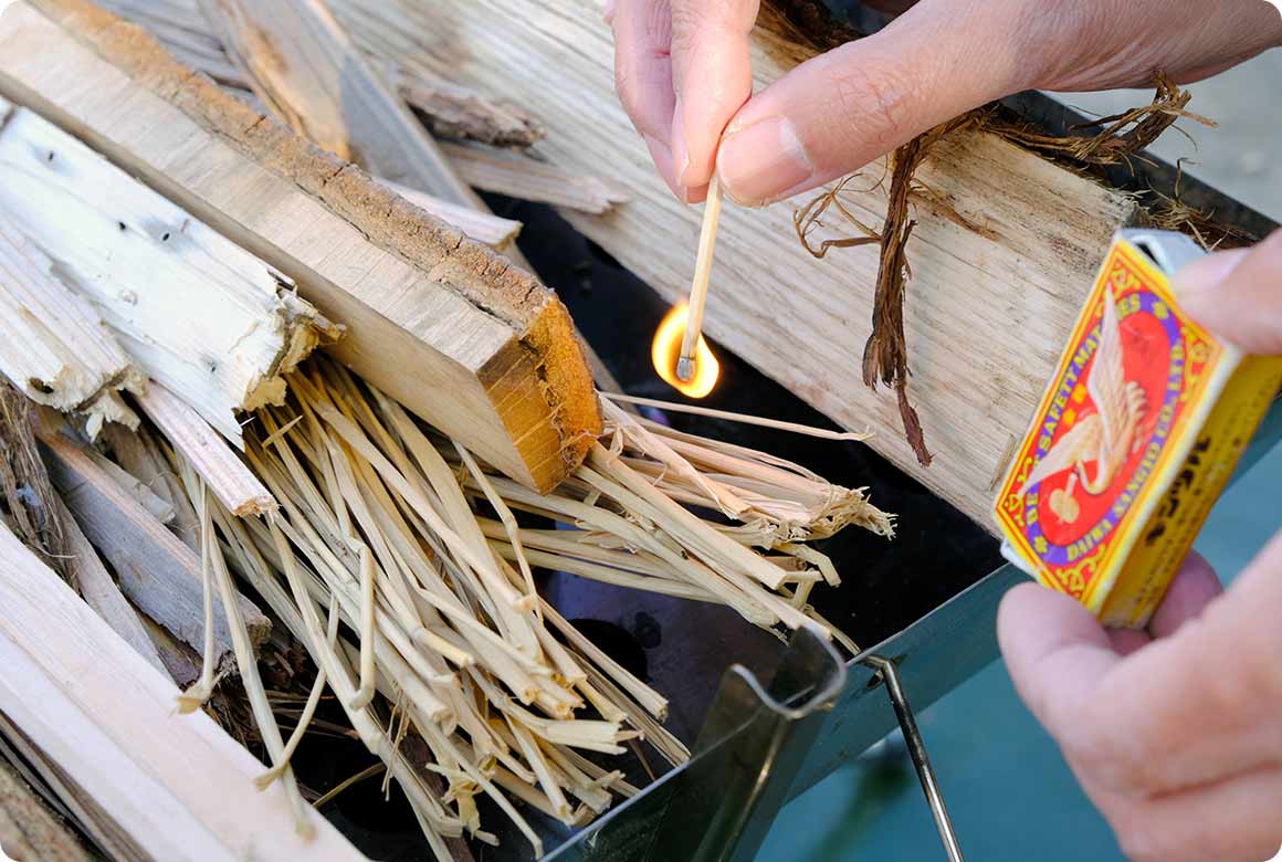 薪の置き方を工夫すれば、気温が低い時期でも燃焼に必要な熱を貯め、立ち消えすることなくスピーディーに焚き火の準備ができます。もちろん、無駄に薪を燃やすこともありません。