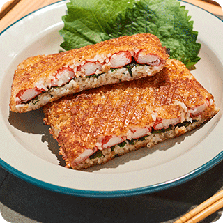 ごはんにカニカマと大葉を挟んでホットサンドメーカーで焼き上げました。最後に追い醤油をして火を入れるとカリッと仕上がり、焦げた醤油の香りが食欲をそそります!