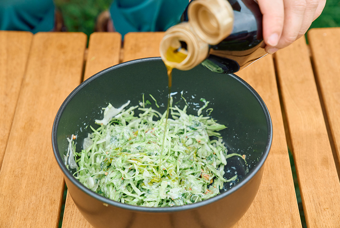 キャベツソースをつくる。キャベツ(ソース用)と大葉を千切りにしたら塩とこしょうをふり、ソース用の材料とあえる。