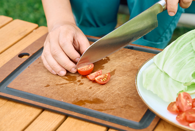 キャベツ(包む用)を大きめにちぎり、ミニトマトを1/4に切る。
