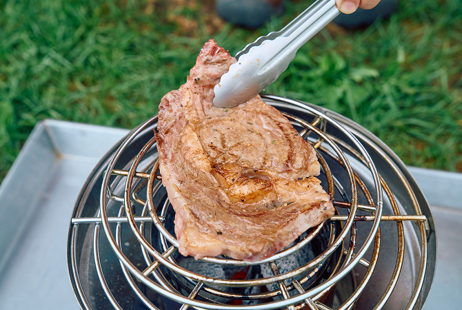牛ステーキ肉に塩とこしょうをふり、しょう油をまぶしてから炭火で焼く(フライパンでもよい)。牛ステーキ肉が焼けたら、ひと口大に切り分ける。