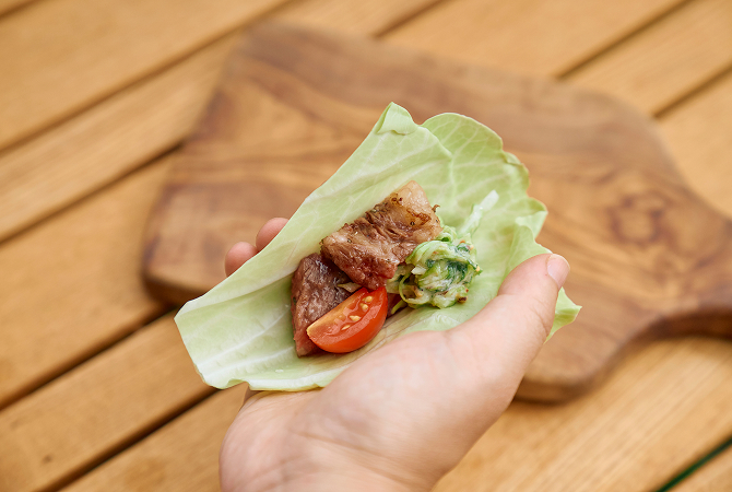 好みの量の牛ステーキ肉、トマト、キャベツソースをキャベツの葉で包んで食べる。