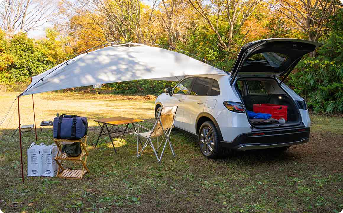 ZR-Vにカーサイドタープを装着すれば、車内を寝床に、カーサイドタープの下をリビングにするスタイルが実現できる。今回撮影で使用したZR-V X(FF)は、全高162cm。市販のカーサイドタープの中には使用推奨全高の範囲外のものもあるため、カーサイドタープを購入する際は適応しているか確認しよう。