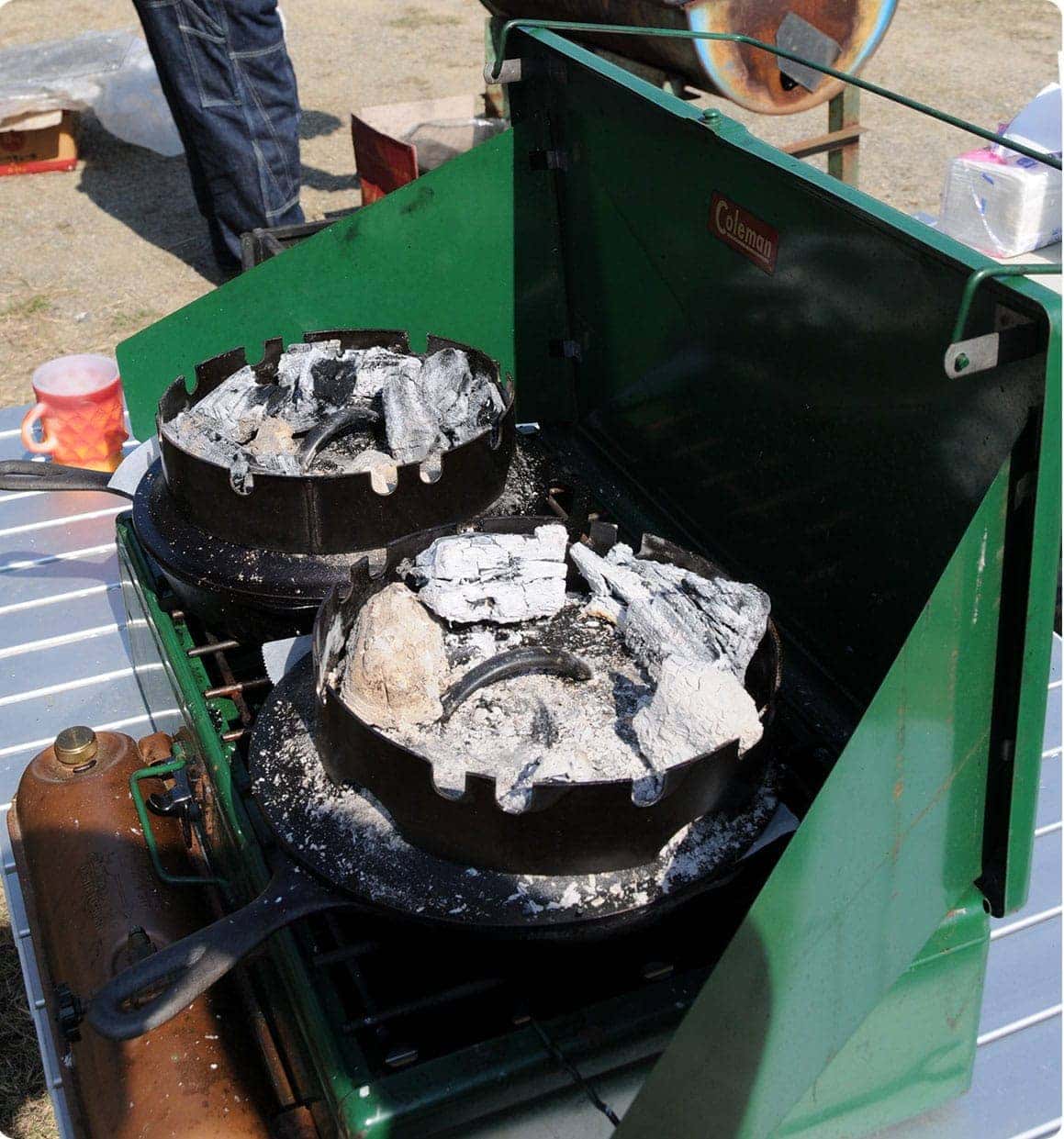 下火はホワイトガソリンやガスのバーナーで、上火を炭…という手もあります