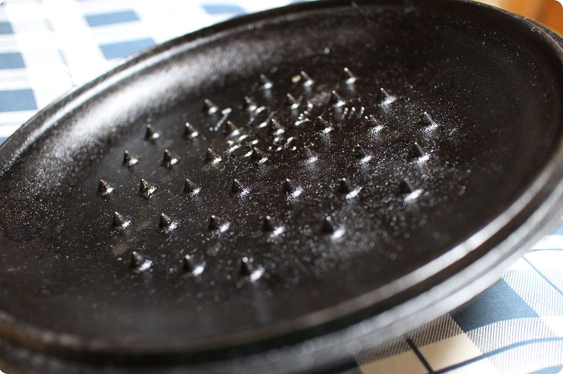 一方、キッチン・ダッチ・オーヴンは、台所で使うため脚はありませんし、フタにフランジもありません。そのかわり、フタの裏側に角のような突起がいくつもついています。これは、素材から出た香りや旨味を含んだ水蒸気を、もう1度、素材に降り注がせるためのアイデア。鍋の中で何度も行き来させて、素材にしみ込ませるわけです。