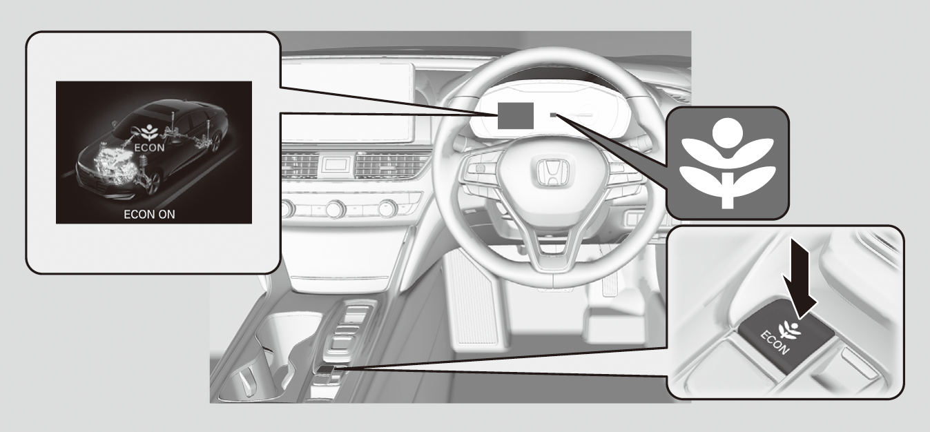 スイッチを押すとエンジン、エアコン、モーターの作動を制御して、省燃費運転をしやすくするように制御します。