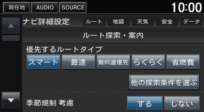 - 季節規制 考慮:季節によって規制の入るルートを考慮してルート計算します。(初期値:する)