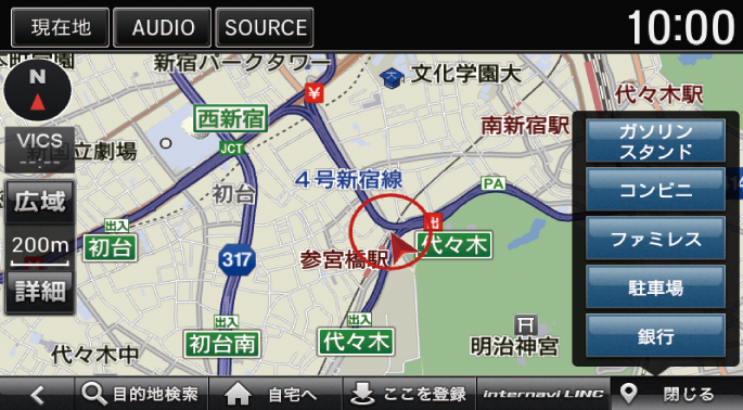 目的地検索後の画面で施設マークを表示して、周辺の施設を確認することもできます。