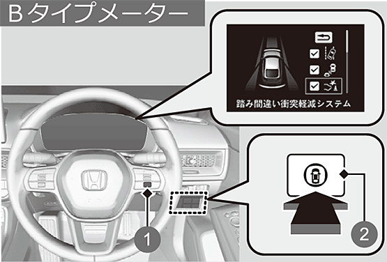 マルチインフォメーションディスプレイから「安全支援情報」を選択することもできます。AタイプメーターBタイプメーターバッテリー再接続後、踏み間違い衝突軽減システムが一時的にOFFになる場合があります。