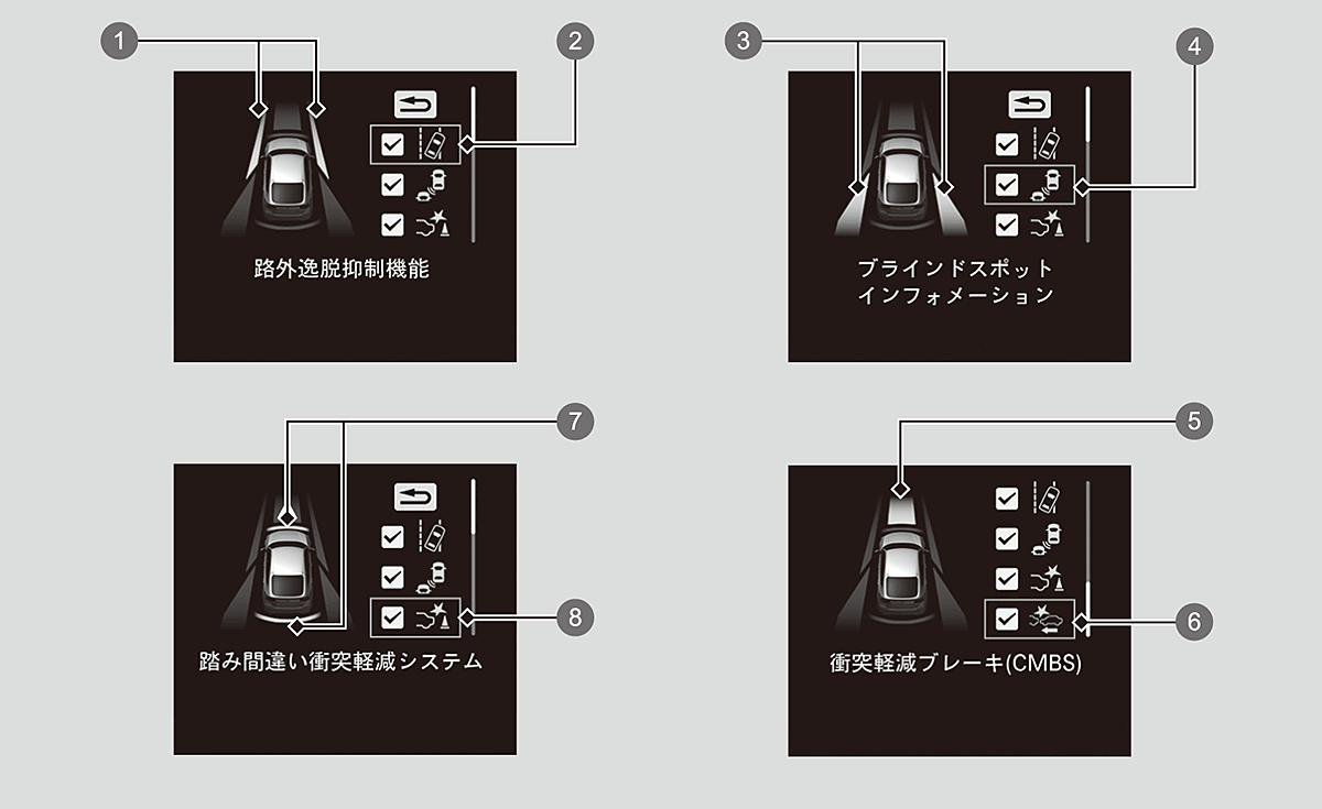 安全支援情報は、路外逸脱抑制機能・歩行者事故低減ステアリング、ブラインドスポットインフォメーション✤、踏み間違い衝突軽減システム、衝突軽減ブレーキの作動状態を表示します。
